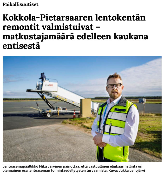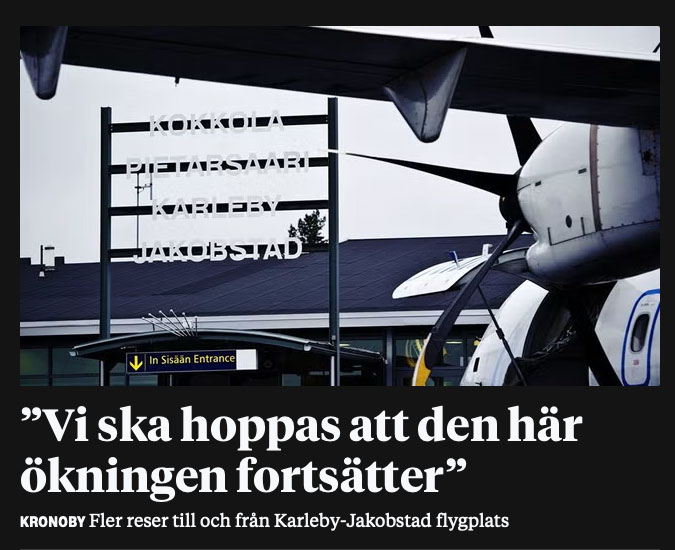 Karleby stad kräver att Finavias riksomfattande flygplatsnätverk måste bevaras i sin nuvarande omfattning och att Orpos regering i sin halvtidsöversyn måste säkerställa att köp av trafiktjänster mellan Karleby-Jakobstad och Helsingfors fortsätter efter att nuvarande finansieringsperiod går ut. »